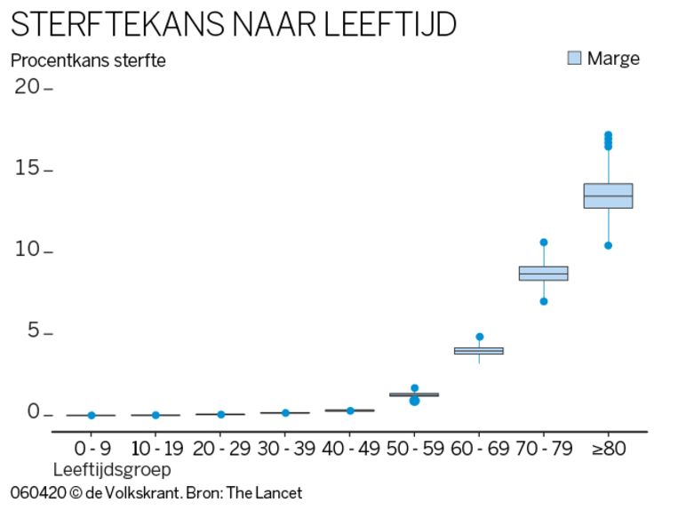 Een verleidelijke gedachte. Want inderdaad, het coronavirus slaat vooral hard toe bij de oudsten. Van de 80-plussers die het virus oplopen, overlijdt uiteindelijk zo’n 13,4 procent, aldus een grote analyse die vorige week verscheen. Bij kinderen jonger dan 10 is dat 0,0026 procent, ofwel een op de veertigduizend.